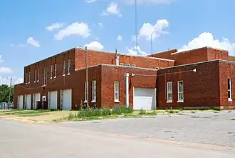 Of the WPA-built armories in Oklahoma, the Enid Armory was the only one utilizing red brick in its construction.[2] The Oklahoma National Guard trained soldiers for combat in World War II and Korea. In 2005, the Base Realignment and Closure (BRAC) Commission voted to close 53 state armories and build Armed Forces Reserve Centers, including one at Vance Air Force Base.[3][4] The Enid Armory location was approved by city commissioners as a new site for Garfield Elementary School, and was demolished by the Enid Public School system, following the opening of the Armed Forces Reserve Center at Vance, and the removal of lead and asbestos from the site by the Oklahoma Department of Environmental Quality.[5][6][7] The first Enid Armory was constructed in 1925 at Phillips University. The 189th Field Artillery Regiment of the Oklahoma National Guard was stationed at Phillips from 1921 to 1936.[8] On July 7, 1933,[9] Clyde and Buck Barrow [10] broke into the armory, stealing a cache of weapons and ammunition and a pair of binoculars.[9] Their take was so large it filled their car, causing seating difficulty,[10] and overflowed from the bathtub they'd used as storage.[9]
