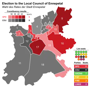 The Ennepetal municipal council governs the city alongside the Mayor. The most recent council election was held on 13 September 2020, and the results were as follows: