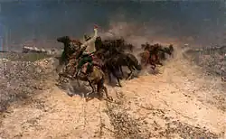 Coleman was initially taught by his father,[3] and either did[4] or did not[5] study at the Accademia di San Luca in Rome. Following the mocking reception of Una mandria di bufali nelle paludi pontine, a naturalistic painting of a herd of buffaloes in the Pontine marshes, at the International Artist's Club in 1872,[2][6] he reportedly began to paint genre subjects in the manner of the then-fashionable Mariano Fortuny, although no works showing the influence of the Spanish painter are known.[7] At the instigation of Nino Costa, he soon returned to the depiction of the people, animals and landscapes of the Campagna Romana and the Agro Pontino.[8][note 2] An album of watercolours from this youthful period (1871–1875) was recently rediscovered and was shown in Rome in 2004.[9]