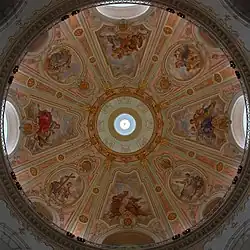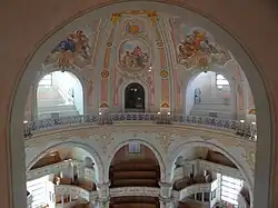 Builders decided not to reproduce the 1736 Gottfried Silbermann organ, despite the fact that the original design papers, description, and details exist, giving rise to the Dresden organ dispute ("Dresdner Orgelstreit").[13] When installed, the Silbermann organ had three manuals with 43 ranks and over the years had been remodeled and expanded to five manuals with 80 ranks.[14] Daniel Kern of Strasbourg, Alsace, completed a 4,873 pipe organ for the structure in April 2005 and it was inaugurated in October of that year; Samuel Kummer was the organist until 2022. The Kern organ contains all the stops which were in the Silbermann organ and attempts to recreate their sounds. The Kern work contains 68 stops and a fourth swell manual in the symphonic 19th century style which is apt for the organ literature composed after the baroque period.