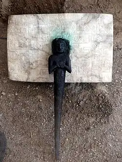 Several votive tablets in the name of Entemena are known. They usually records Entemena's name, title and filiation, and his accomplishment in establishing temples or devotional images. The tablets are often associated with a "foundation nail", called temen ("foundation") in Sumerian, which was inserted into the ground under the foundation of temples, together with the inscribed tablets and offerings such as jewelry or small statuettes of protective divinities.[24][25] A proclamation on one of the foundation stones of Enmetena says that he "instituted liberty in Lagash. He restored the child to its mother, and the mother to her child; he cancelled interest." This is the first known mention of the word ama-gi, translated here as liberty.[26]