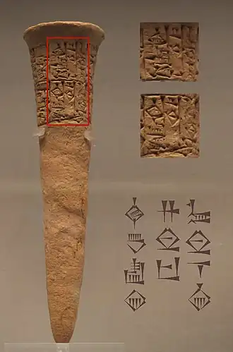 Cone of Enmetena, king of Lagash, Room 236 Reference AO 3004, Louvre Museum (upside down).[15][14]