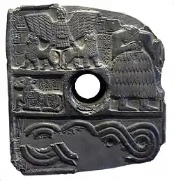 It is inscribed with the following text: "For Ningirsu of the Eninnu, Dudu, priest of Ningirsu ... brought [this material] and fashioned it as a mace stand."[27] The exact function of the plaque is unknown: it has been interpreted as a mace-holder, a plaque to be nailed into the wall of a temple, or a door panel.[27]