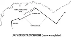 In fortification, the term entrenchment (Italian: trincieramento, Maltese: trunċiera) can refer to either a secondary line of defence within a larger fortification (better known as a retrenchment), or an enceinte designed to provide cover for infantry, having a layout similar to a city wall but on a smaller scale. The latter usually consisted of curtain walls and bastions or redans, and was sometimes also protected by a ditch.[1]