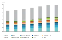 Aviation GHG emissions within the European Economic Area for the EU ETS, showing the top 10 emitters (2013–2019).[25]
