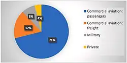 In 2016, the International Civil Aviation Organization (ICAO) committed to improve aviation fuel efficiency by 2% per year and to keeping the carbon emissions from 2020 onwards at the same level as those from 2010.[69] To achieve these goals, multiple measures were identified: more fuel-efficient aircraft technology; development and deployment of sustainable aviation fuels (SAFs); improved air traffic management (ATM); market-based measures like emission trading, levies, and carbon offsetting,[69] the Carbon Offsetting and Reduction Scheme for International Aviation (CORSIA).[70]