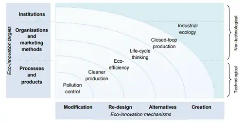 Technological eco-innovations focus on modifying, redesigning, and creating processes and products to reduce environmental impacts while maintaining or improving economic performance.[7] They typically involve cleaner production methods, resource efficiency measures, life-cycle thinking, and the development of closed-loop manufacturing systems.[6]
