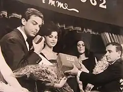 ![]() Enzo Mirigliani at right in Miss Italia 1962, with Raffaella De Carolis and presenter Daniele Piombi | |