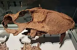 Eotitanosuchus is known from a single large skull without a lower jaw. The skull was 35 cm (14 in), but the overall length may have been over 2.5 m (8 ft 2 in), possibly up to 6 m (20 ft) and more than 600 kg (1,300 lb) in weight for adult specimens.[1] Like Biarmosuchus tener, it was primitive in that, though it was a predator, the temple opening behind the eye was small, giving it a weak bite. The temple was, however, larger at the top than in other biarmosuchians.