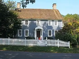 The Ephraim Wheeler House stands in what is now a suburban residential area of Stratford's Putney neighborhood, on the north side of Whippoorwill Lane at its junction with Rosebrook Drive. It is a 2+12-story wood-frame structure, five bays wide, with twin chimneys, shingled exterior, and a side-gable roof. Small additions added in the 19th and 20th centuries expand the building to three sides. The main entrance is flanked by sidelight windows and sheltered by a small gable-roofed portico with round columns. The interior follows a central hall plan, and retains original features, particularly the fine Georgian woodwork of the main hall and stair.[2]