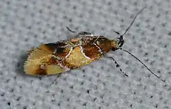 The wingspan is 10–13 mm. The forewings are yellowish-orange with a silvery black-margined line along the basal margin from the fold to the basal angle. There is a similar line from the basal third of the inner margin to the costa. The basal area between these lines is deep reddish orange. The hindwings are fuscous.[3] Adults are on wing from April to October.[4]