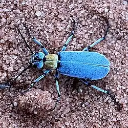 Epicauta wheeleri is a species of blister beetle in the family Meloidae. It is referred to colloquially by the common name "ethereal beef weevil" in areas of southern Utah and Nevada, as well as other parts of the southwest. This name refers to the beetle's stunning iridescence in the harsh desert sunlight, and it's very pronounced body segments (similar to those typical of a weevil), along with the fact that it is often found in and around cattle pastures by beef ranchers and farmers. However, it is not a true weevil, and is actually a blister beetle. It is found in North America.[1][2][3]