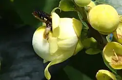 The genus Epicharis contains fewer than 40 species of large apid bees occurring in the Neotropics (from Mexico to Brazil [1]), most of which possess adaptations for carrying floral oils rather than (or in addition to) pollen or nectar. The floral oils are typically gathered from plants of the family Malpighiaceae, though other plants may be visited. They also commonly gather plant resins for use in nest cell construction. Recent studies have shown they are sister to the clade formed by corbiculate bees (the most well-known and economically important group of bees) plus Centris [2] They are large bees, generally with a black head and mesosoma, and the metasoma is often red, and/or has bright yellow spots or bands. They are distinguished from the closely related genus Centris by two sets of three long, whip-like setae that project backwards from just behind the eyes.