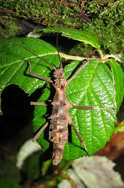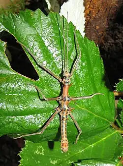 The insects live on low shrub vegetation of the tropical rainforest. As food plants are known, Rosaceae like the Molucca bramble (Rubus moluccanus), Melastomataceae like Clidemia hirta, Vitaceae like Leea indica, Acanthaceae as Strobilanthes alternata and Bonnetiaceae as Ploiarium alternifolium. The females lay one to three eggs about 3.5 to 3.9 mm long, 2.9 to 3.1 mm wide and an average of 6.8 mg each week for a period of up to twenty months. These are covered with barbed hairs. They are placed individually in a hollow dug with the legs. The abdomen is bent forward over the back and the then released egg is rolled over the parallel held antennae into the hollow. This is covered again after the eggs have been laid.[3] After three to six months, the seven to twelve millimeter long nymphs hatch from the eggs. Males are after about eight months, females after about ten months adult. After another three to four weeks, the females begin to lay eggs.[5][6][7]