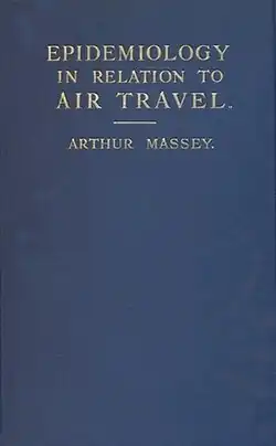 Epidemiology in Relation to Air Travel was written by the Coventry-based medical officer of health Arthur Massey, and published by H. K. Lewis and Co. Ltd. in 1933, when the topic was relatively new,[1] and in the year after the International Sanitary Convention for Aerial Navigation was drawn up.[2] It has 59 pages and five maps.[1]
