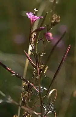 Epilobium oreganum is an uncommon species of flowering plant in the evening primrose family known by the common names Grants Pass willowherb and Oregon fireweed (though it is not a true fireweed). It is native to southern Oregon and northern California, where it is historically known mostly from the Klamath Mountains. It is currently confirmed to exist only in Josephine County, Oregon, and Trinity County, California, where it grows in boggy areas on serpentine soils.[2] It is a perennial herb growing up to a meter in height with thin, hairless stems. The red-veined leaves are oval to lance-shaped and up to 9 centimeters long. The inflorescence bears flowers with pink petals just over a centimeter long and a protruding pistil. The fruit is a hairy, glandular capsule up to 4.5 centimeters long.