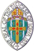 The present coat of arms for the Diocese of Iowa were designed by Cram and Ferguson and approved at the 1946 Diocesan Convention. The arms consist of the a field of green, which represents Iowa's prairies, bisected by two lines that represent the Mississippi River and the Missouri River. The gold cross contains five red diamonds which represent the five communities where the Episcopal Church in Iowa was organized: Dubuque, Davenport, Muscatine, Burlington, and Keokuk. The cross is surrounded by four ears of corn that represents Iowa's agricultural heritage. A bishop's mitre tops the shield and it is surrounded by the words, "Seal of the Diocese of Iowa 1853."[5]