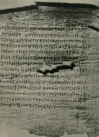 No surviving ancient Christian writings seem to refer to it, suggesting its circulation was limited.[5] The work was lost to most of the world; copies were still produced and maintained in certain Ethiopian monasteries as late as the 16th century, but it was a minor and obscure work there, and completely unknown elsewhere. In 1895, major portions of it were discovered in the Coptic language from a 4th–5th century manuscript by Carl Schmidt, a German Coptologist.[5] In 1910, the English scholar M. R. James spotted similarities between the initial Coptic translations provided by Schmidt and various translations of unclassified Ethiopic documents; he realized that the Ethiopic manuscripts were likely from the same work as the Coptic manuscript.[6] This Ethiopic language version also was more complete, including sections that were too damaged to read in the Coptic manuscripts. A French-Ethiopic edition was published in 1913, and a combined German-Coptic-Ethiopic work published by Schmidt in 1919.[7] The fragmentary Coptic manuscript is believed to be translated directly from the original Greek. The Ethiopic was also probably directly translated from Greek, although some have proposed it was translated from a Coptic or Arabic version instead.[8][4] M. R. James also identified that one leaf of a Latin palimpsest, dating to the 5th century, was derived from the same text.[9][5][6]