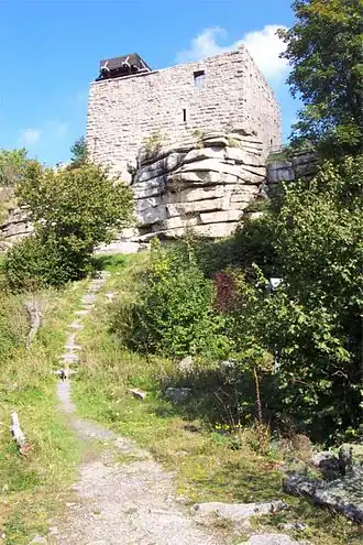 On the treeless summit on a long, steep-sided, granite slab stands the ruined castle of Epprechtstein. This is the old tower-like main residence on which a staircase has been built leading to an observation platform. From here there is a panoramic view of the Waldstein ridge, the Großer Kornberg, to Schwarzenbach an der Saale and Oberkotzau as far as Hof, and south to the inner Fichtel Mountains and Kösseine. Two hundred and fifty metres southeast is a service hut belonging to the Kirchenlamitz Mountain Rescue service.