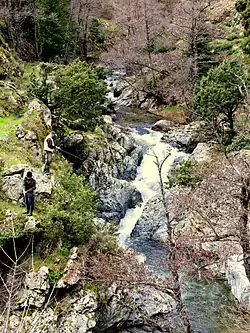 The Erco is 11.18 kilometres (6.95 mi) long. It crosses the communes of Calacuccia, Corscia and Lozzi.[1] The stream originates in the commune of Lozzi to the south of the 2,706 metres (8,878 ft) Monte Cinto. It flows in a generally southeast direction to its confluence with the Golo between Calacuccia and Corscia. The D84 road crosses the Erco just above its mouth, but otherwise there are no roads along its course.[2]