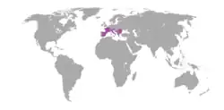 This European endemic species is present in Spain (Cantabrian mountains, Pyrenees), France (Pyrenees, Massif Central and the western and eastern Alps), Italy, Switzerland, Romania (Carpathians), Bulgaria (Rila and Pirin Mountains.), Greece, North Macedonia and in the Balkans (Serbia, Montenegro, Albania and Bosnia). It prefers grassy slopes with stones and rocks at altitudes between 1,600 and 2,600 meters.[7][8][9]