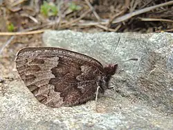 E. lappona Esp. (= manto Frr., zilia Bkh.) (37 i). Upperside of both wings black-brown, somewhat glossy, the ground-colour of the female lighter, more grey-brown. The forewing with a rather broad russet brown band which does not reach the hindmargin and bears 4 black ocelli without pupils, the 2 upper ones standing close together and being somewhat shifted proximad. The band is not always equally distinct, varying in several directions. The hindwing has 3 - 4 black ocelli in russet -brown rings or is entirely unicolorous without markings. The forewing beneath with the central area russet -brown, the costal and distal margins being dusted with white-grey or bluish white, and the hindmargin black-brown. The ocelli as above, but mostly placed in russet -yellow rings. The hindwing beneath whitish or bluish grey with a median band which is bordered both proximally and distally by a thin brown dentate line. In the female this median band is more or less dusted with brown, the dentate lines being darker and broader and the band therefore more prominent than in the male. Before the distal margin there are 2 or 3 black dots which are sometimes absent. Head, thorax and abdomen black, the last ashy grey beneath. Antenna brown above, grey beneath, with yellow club. In the Pyrenees, Apennines, Alps and Carpathians, mostly only at considerable altitudes. — In ab. pollux Esp. (= dubius Fuessl, aglauros Hbst., baucis Schk.) the underside is dusted with white-grey, without markings ; singly among the nymotypical form, in Graubunden and in Finmark. — ab. castor Esp. (= pandrose Bkh.) has the upperside duller in colour, bearing 2 subapical dots; the very evenly leaden-grey underside of the hindwing is traversed by 2 sharply marked black-brown dentate line. An insignificant aberration, which perhaps flies everywhere in the Alps among nymotypical specimens. — In the form sthennyo Grasl. which occurs in the Central Pyrenees, the distal band of the forewing is not russet-brown but yellowish red, being proximally but indistinctly or not at all defined. The ocelli bordered with yellow rings above and beneath. — In ab. stelviana Gumpp. the forewing has no ocelli above. From the Tirolese Alps, but occurs as aberration almost everywhere among nymotypical specimens. — In the northern form mantoides Btlr. the ocelli of the forewing beneath are contiguous, forming a chain. —The Central -European mountain-form as well as the arctic form, however, vary so much individually that nearly all the aberrational forms occur in both districts. — Larva adult grass-green; head, a dorsal line, lateral macular lines and the spiracles black. Feeds on grass, and contracts like a slug when being touched. In May it changes into an obtuse pupa, which lies free on the ground and has the anterior part of the body green and the abdomen brownish. The butterfly appears according to altitude either in June or August. In the Alps one usually meets with it only from the tree-line up to the snow. It flies especially on stony slopes with a sparse covering of grass and settles by preference on the ground, visiting flowers but rarely. It is very shy and therefore not easy to catch.[1]