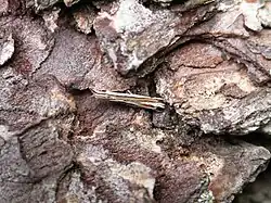 Adults are on the wing from September until February.[10] During the day they can be observed resting on tree trunks or fences where their colouration provides surprisingly good camouflage.[7] At night this moth is attracted to light.[11][12]