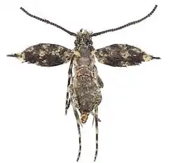 The length of the forewings is 1.4–1.8 mm. This wing reduction occurs in both sexes. It is one of the few species of Lepidoptera known where this extreme of brachyptery involving both sexes has evolved. The forewings are dark fuscous with an irregular scattering of dull white scales at the base of the wing and mostly crossing the wing beyond the middle. There is a slightly larger concentration of dull white scales at the apex and extending a short distance along the costa. The hindwings are minute, slightly variable in size and without scales.
