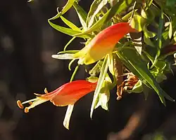 The flowers are borne singly in leaf axils on a stalk 10–20 mm (0.4–0.8 in) long. There are 5 overlapping, sticky, egg-shaped to elliptic sepals which are 10–15 mm (0.4–0.6 in) long. The petals are 25–35 mm (0.98–1.4 in) long and joined at their lower end to form a tube. The top of the petal tube is red to orange, fading to yellowish-green below and inside the tube. Occasionally the petal tube is all yellow. The tube often has a few short hairs inside and out and is sticky on the outside. The 4 stamens extend beyond the end of the tube. Flowering occurs from June to September and is followed by fruits which are dry, oval to cone-shaped with a pointed end and are 7.5–13 mm (0.3–0.5 in) long.[3][4][2][5][6]