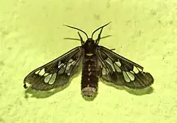 The wingspan is 20–23 mm.[2] Antennae bipectinate (comb like on both sides) in male, branches short and dilated distally. Antennae serrate (tooth like on one side) in female. Body dull black with a large yellow spot on prothorax and streak on metathorax. Abdomen with yellow spots on vertex and side of each segment. Female has an ochreous anal tuft. Forewings are with a hyaline spot in cell. There is one in interno-median interspace and one in each marginal interspace. Hindwings with a hyaline patch on disk, divided into four by veins.[3]
