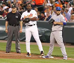 The Royals recalled Hosmer on May 5, 2011.[2] Veteran catcher Jason Kendall was moved to the 60-day disabled list to make space for Hosmer on the 40-man roster.[24] He made his MLB debut at first base the following day against Oakland Athletics starter Gio González, replacing Kila Ka'aihue.[25] Prior to his debut, Hosmer was being touted by journalists as a "super-prospect" and the "most-hyped" rookie to debut for the Royals since Bo Jackson.[2][26] The Royals promoted Hosmer before a mid-June deadline in which the Royals could have avoided salary arbitration for an extra year.[27] Hosmer went hitless in two at-bats, striking out twice. He also walked twice and stole a base in a 3–2 loss as the Royals had the second biggest crowd of the season.[28]