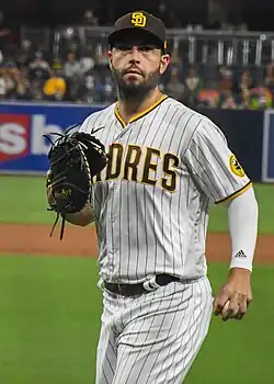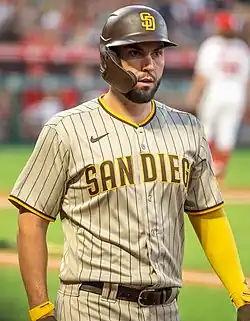 On February 19, 2018, Hosmer signed an eight-year, $144 million contract with the San Diego Padres, the largest contract in Padres franchise history at the time.[56] Hosmer changed his jersey to No. 30 in honor of former Royals teammate Yordano Ventura, who had died a year earlier. Hosmer's previous No. 35 was already retired by the Padres for Randy Jones.[57] In his first season as a Padre, Hosmer hit .253 with 18 home runs and 69 RBIs. In 2019, Hosmer slashed .265/.310/.425 with 22 home runs and 99 RBI as the primary cleanup hitter for the Padres.[58] He led all NL first basemen in errors, with 14.[59]