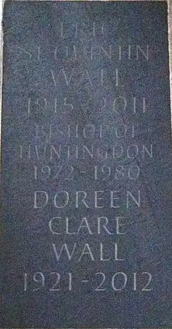 Eric St Quintin Wall (19 April 1915 โ 11 April 2011)[1] was the second Bishop of Huntingdon from 1972[2] to 1980 and from then on an Assistant Bishop within the Diocese of Gloucester. The son of a clergyman โ Sydney Herbert Wall[3] โ, he was born on 19 April 1915 and educated at Clifton College and Brasenose College, Oxford. Ordained in 1939 he began his ecclesiastical career with a curacy in Boston, Lincolnshire[4] after which he was a World War II chaplain in the RAFVR. When peace returned he held incumbencies at Malmesbury, Cricklade[5] and then finally (before his appointment to the episcopate) at Westbury Park, Bristol.