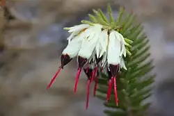 E. recurvata is a shrub of some 30 to 60 centimetres (12 to 24 inches) in height. It has dense whorls of small needle-like leaves which are pale green to grey-green in colour, and recurving in habit, hence the specific name. Clusters of sticky, pendulous flowers appear in winter, having white sepals, dark brown to almost black corollas, and with long, red, exserted styles.