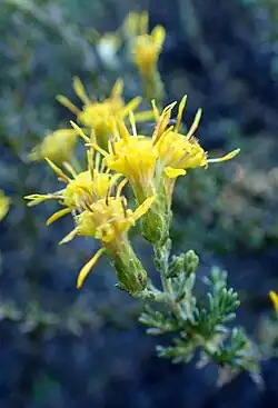 Its small erect branches are topped with inflorescences of small golden yellow flower heads, each with several disc florets and a few ray florets.[5]