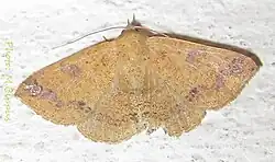 The wingspan is 47–48 mm.[4] Adults are sexually dimorphic and highly variable in color. Palpi with longer third joint. Hindlegs of male tufted with long hair to the extremity of the tarsi. Mid tibia of male with large masses of flocculent hair contained in a fold. Body purplish grey, ochreous, reddish or fuscous brown with more or less irrorated with fuscous. Forewings with sub-basal, antemedial, medial, postmedial and sub-marginal indistinct sinuous dark lines. The minute orbicular and large reniform spots are indistinct. There is an almost marginal dark specks series. These markings may be obsolete or fairly prominent. Each line may be double and consist of disjoined striga or lunules. The area inside the sub-marginal and medial lines is fuscous suffused, or ferrous. Some forms have elongate or prominent reniform. A grey apical patch and a dark spot on sub-marginal line above inner margin found in ochreous forms. Hindwings with indistinct medial line with crenulate line beyond it. A waved submarginal line and almost marginal dark specks series can be seen.[5][6]