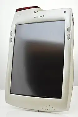 In 2000 ECS produced its first smartphone, Ericsson R380. It did not meet with commercial success, but was the first phone to use the Symbian operating system, previously known as EPOC. The company also produced a Handheld PC named Ericsson MC218, an OEM-product based on Psion Series 5mx.[15] At this time various experimental projects involving handheld PCs was running: in the annual report of 1999 is a picture of a handheld PC named HS210 cordless display phone which would use Bluetooth to connect to a small base station in a household,[16][17] and another experimental product was the DelphiPad which was developed in cooperation with the Centre for Wireless Communications in Singapore, a tablet computer with touch-sensitive screen, Netscape Navigator as web browser and Linux as its operating system.[18][19] These products were never finalized, but pictures of these prototypes have circled the web.