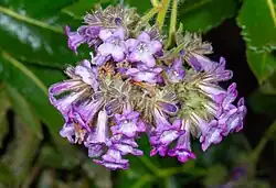 This species grows in a perennial shrub habit. The stem is 1 to 3 m. Leaves are sessile, with the blade 6 to 12 cm, 2 to 5 cm wide, shaped oblanceolate to oblong, coarse-toothed. The upper surface of the leaves are sparse to coarse-hairy, while the bottom face is sparsely to moderately coarse-hairy on the veins, stalked-glandular on all veins, with short hairs between veins. The margin is slightly rolled under between the teeth. The peduncle and pedicel are hirsute. The flower is mostly coarse-hairy throughout, including on the filaments and ovaries. The calyx lobes of the flower are 5 mm, while the corolla is 12 to 15 mm long, funnel shaped, and colored lilac purple. The fruits are 5 mm large, and also coarse-hairy. The chromosome count is n=14. Flowering is from April to June.[1]