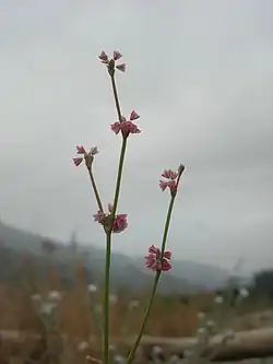 Eriogonum davidsonii is a species of wild buckwheat known by the common name Davidson's buckwheat. This plant is native to the southwestern United States and northern Baja California.[1] It grows in sandy or gravelly soils, mixed grassland, saltbush, chaparral, sagebrush communities as well as oak and montane conifer woodland.[2] It is a spindly annual herb growing up to 40 centimeters in height. Leaves are fuzzy, basal, and round with wavy or wrinkly margins fuzzy. They are two centimeters wide. The plant is variable in appearance, but is usually erect with thin, naked, neatly branching stems bearing clusters of tiny flowers at widely spaced nodes. Each flower is about 2 millimeters wide, bell-shaped, and can be white, pink or red. Flowering occurs May to September.[1][2]