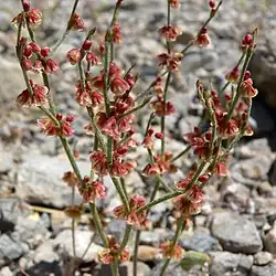 When in bloom the plant produces tiny fan-shaped hanging clusters of flowers at nodes along the thin branches of the stem. The flowers are yellowish to pinkish, sometimes with small streaks of bright red.