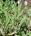 This wild buckwheat is quite variable in appearance.[2] It has spreading stems that grow usually grow erect, but may be decumbent or prostrate along the ground. It forms a hairy mat generally up to 40 to 60 centimetres (16 to 24 inches)[1][2] tall and wide, but it can reach a height and width of one meter at times.[5] Most of the leaves are in a tuft on the woody base of the plant. They are up to 6 centimeters long and have a woolly texture. The inflorescence is a series of branching stems with sparse clumps of small white, pink, or reddish flowers.[1][2][4]