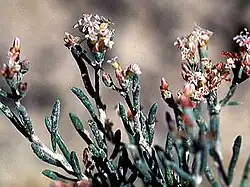 This is a subshrub with branches spreading wider than they grow tall, the plant reaching perhaps 12 centimeters tall by 40 wide. The woody stem bases emerge from a big taproot, and as they age the bark comes off in strips or plates. The upper branches are hairless or tufted with bits of hair. There are solitary leaves widely spaced on the branches. They are lance-shaped, no more than 1.5 centimeters long, and hairy on the undersides. The inflorescence is a small, dense cyme of flowers 2 or 3 centimeters long and packed with tiny whitish or cream-colored flowers.[3][4][5] The flowers are pollinated by ants,[4] of which 18 species have been observed on the plants.[6]
