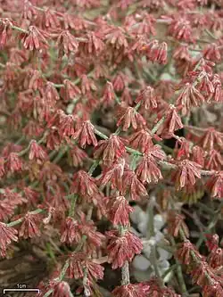 This is a variable perennial which may be a spindly 10 centimeters in height or a bushy 40 centimeters. The rounded or scoop-shaped leaves appear in a mat on the ground, each up to 2 or 3 centimeters wide at maximum, and densely woolly. The stout, woolly inflorescence branches and produces flower clusters at nodes. The flowers are generally red or pale yellow.