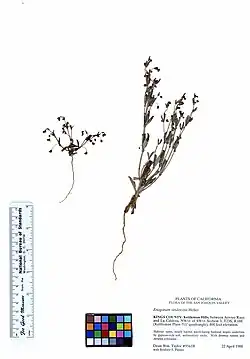 This is a slender annual herb producing flowering stems up to about 30 centimeters tall surrounded at the bases by woolly oval leaves. The inflorescence is a wide open array of branches lined with clusters of white or pink flowers. Each flower has lobes that are only about a millimeter long and wider at the tips.