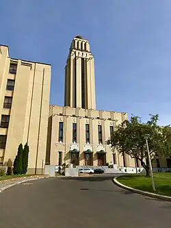Cormier's major work is the central building of the Université de Montréal (now known as the Roger Gaudry Building) on the north slope of Mount Royal. This huge example of the Art Deco style was built between World War I and the middle of World War II, and it has been kept in a nearly pristine shape over the decades. It is a composition of simple forms of planes and surfaces in successive relief, emphasizing vertical lines. The light buff vitrified brick has trimmings of Missisquoi marble.[2] The only major destruction of his designs took place within the interior spaces. These changes occurred in the 1970s, when the great multi-storey hall of the central library was filled up with several smaller, single-storey rooms for the faculty of medicine and its library.