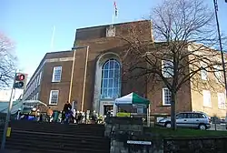 Tunbridge Wells assembly hall was opened on 24 May 1939 by Lady Joan Marion Pratt, Marchioness Camden, wife of the Lord Lieutenant of Kent.[50] It was built between 1934 and 1939, and is a listed building in its own right.[16][51][52][53] The group of Tunbridge Wells police station, courts and library, completed in 1939, comprises two listed buildings. The style is described by English Heritage as "Neo-Georgian style with Moderne details".[54] The buildings are in "brown brick with reconstituted stone dressings". The middle window of the library and museum is larger than the rest, and has a bas relief of Ancient Greek gods above, and a door within the window. Inside that building is a "large well staircase with stylised Greek key design to cornice".[55] The police station and courts building is also in brown brick, but has Portland stone dressings. Its bronze main doors have above them a "semicircular tympanum with classical figures with scales of justice and motto, do well doubt not.[54]