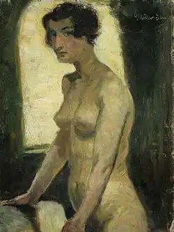 In 1910 he set up a studio in the Roselius building "Roselius-Haus" along the Böttcherstraße, then as now the artists' quarter of central Bremen.[9] That was where, in 1913, he held his first exhibition.[1] Müller-Scheessel was a prolific artist: the exhibition featured around 150 works in oil, watercolour and gouache, along with some of his furniture designs. In 1918, with the Fischerhude artist Fritz Cobet, Müller-Scheessel was co-founder of the "Bremer Kunstlerbund" ("Bremen Artists' Association").[6] The next year he took a job at the newly opened Bremen adult education college ("Bremer Volkshochschule""), teaching North German Applied Arts. In parallel, at this time he was teaching watercolour painting and glass painting at the Bremen "Applied Arts Academy ("Kunstgewerbeschule").[1][4]