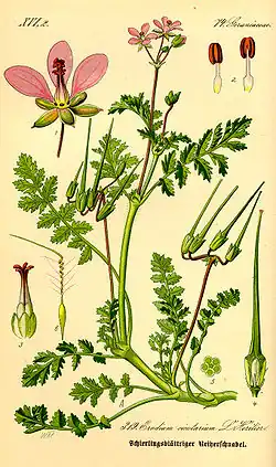 The stems bear bright pink flowers which often have dark spots on the bases. The flowers are arranged in a loose cluster and have ten filaments – five of which are fertile – and five styles.[6] The leaves are pinnate to pinnate-pinnatifid, with hairy stems.[7] The long seed-pod, shaped like the bill of a stork, bursts open in a spiral when ripe, sending the seeds (which have long tails called awns) into the air.