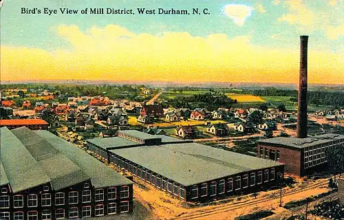 In the post-war South, subsistence agriculture and the plantation system yielded to more commercialized agriculture, which required less manpower, freeing labor to work in the mills. Many subsistence and yeoman farming families who faced hard times flocked to urban centers in search of work.[7] The construction of complex railroad networks happened simultaneously to the growth of southern cities, making them prime candidates to become centers of industrialization.[8] The growth of cities and infrastructure in the South allowed entrepreneurs open large factories, which took advantage of cheap labor that was rarely under the influence of a union.[5] Many opened textile factories to manufacture the cotton crop that the Southern states had produced for years. By the turn of the century, much of the textile industry had shifted from the Northeastern United States to the South.[5] In 1900, there were 177 mills in North Carolina alone.[9] The industry reached Durham in the 1880s, when Durham businessman Julian Carr opened the Durham Cotton Manufacturing Company to manufacture cloth bags for tobacco.[10] The mill's early success confirmed that a textile mill located in Durham or the surrounding area could be successful.[2]