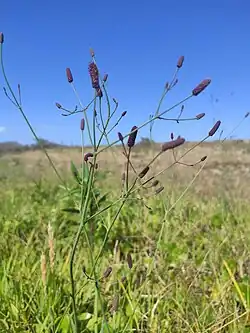 Eryngium ebracteatum is an evergreen herbaceous perennial growing to a height of 1.5 meters. The species has grey-green lance shaped leaves which in contrast to other South American Eryngium are almost or entirely spineless. The inflorescences, which are cone shaped and deep-red are held on wiry branching stems, due to the absence of bracts and reddish color they are often confused with sanguisorba L. species such as S. tenuifolia Fisch. ex Link. and S. officinalis L.[5] E. ebracteatum has underground storage organs and long taproots with little branching.[6] The glaucous leaves of this plant are a result of a covering of epicuticular waxes, the particular arrangement of these wax crystals makes the leaves ultrahydrophobic. In plants this adaptation is known as the lotus effect, and it thought to aid in the removal of dust and soil particles from the leaves which may contain pathogens or reduce photosynthesis.[7]